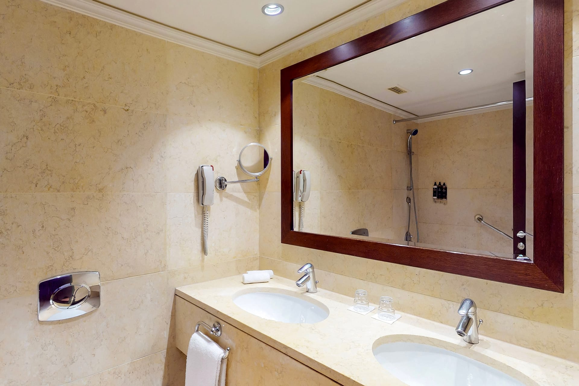 Beautiful rooms with en suite marble bathroom with bathtub, an elegant sitting corner separated by louvers (sliding door) for more privacy & comfort, and view to the Golf area. All rooms are equipped with hairdryer, makeup & shaving mirror, bathroom amenities, bathrobes & slippers, telephone, SAT TV, Air-condition, mini bar, Safe, free WI-Fi and furnished balcony.