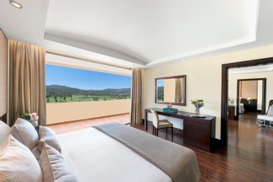 Spacious two-bedroom suites, each off ering en suite marble bathroom, connected to well-appointed sitting area with separated WC and superb view to the golf area. All suites are equipped with hairdryer, makeup & shaving mirror, bathroom amenities, bathrobes & slippers, coff ee & tea faciliti es, telephone, SAT TV, Air-conditi on, mini bar, Safe, free WI-Fi and furnished Terrace with sunbeds.