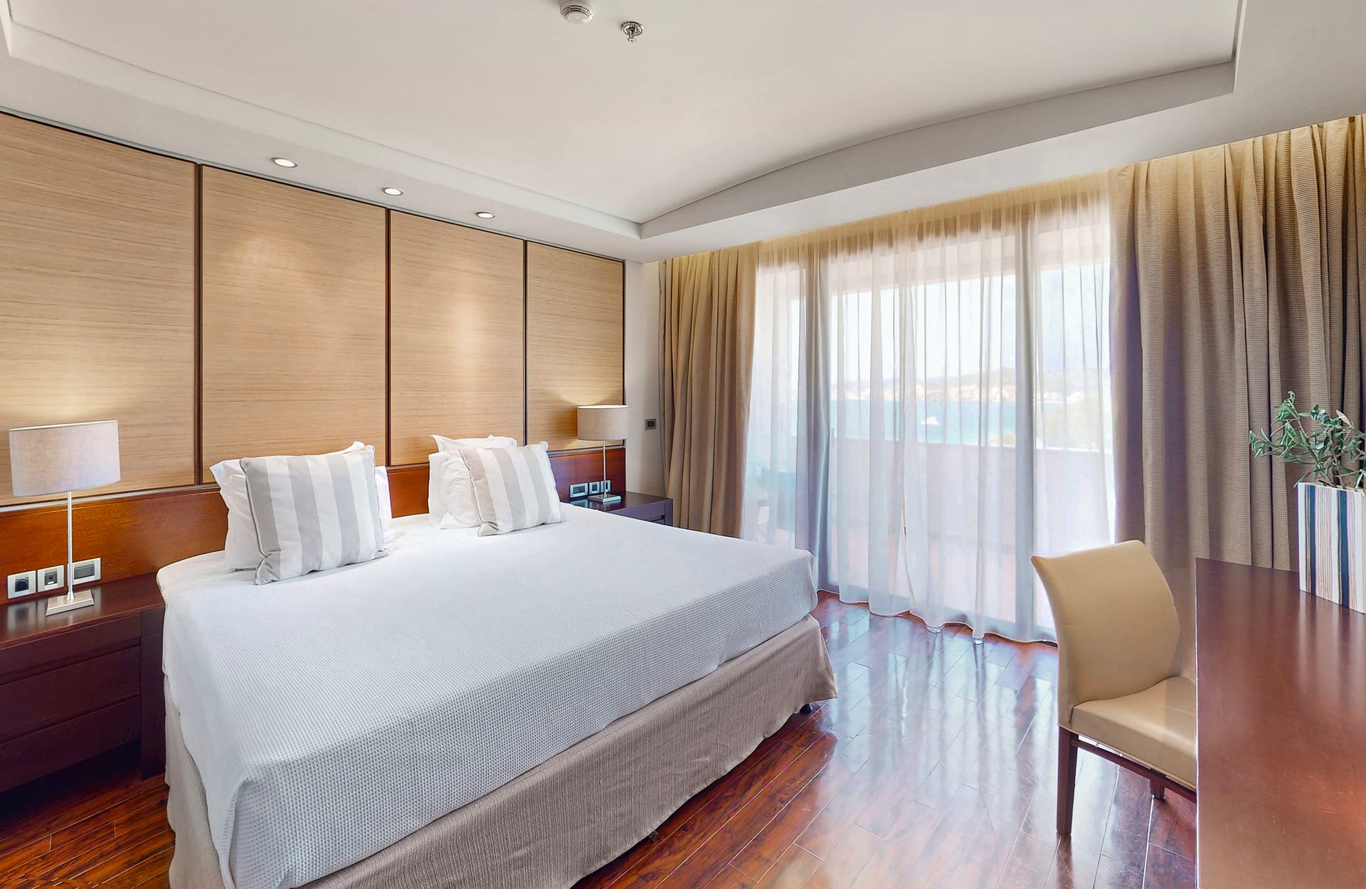 Spacious two-bedroom suites, each offering en suite marble bathroom, connected to well-appointed sitting area with separated WC and superb view to the sea or marina. All suites are equipped with hairdryer, makeup & shaving mirror, bathroom amenities, bathrobes & slippers, coff ee & tea facilities, telephone, SAT TV, Air-condition, mini bar, Safe, free WI-Fi and furnished Terrace with sunbeds.