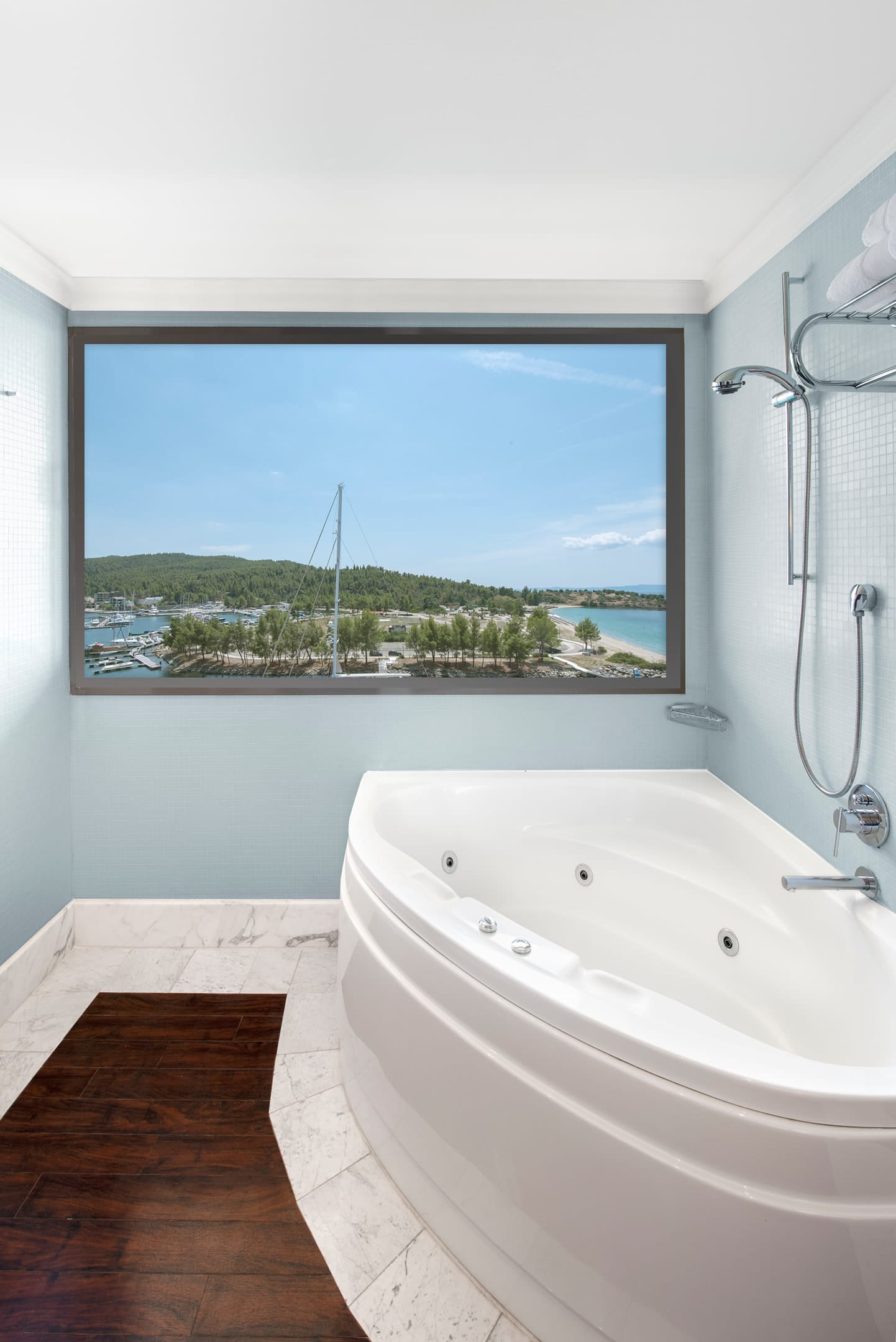 A high luxurious one-bedroom suite, off ering en suite marble bathroom equipped with hydromassage bathtub & shower cabin, a unique living area equipped with fi replace, kitchen area separates WC, with view to the sea and the gardens. All suites are equipped with hairdryer, makeup & shaving mirror, bathroom ameniti es, bathrobes & slippers, coff ee & tea faciliti es, telephone, SAT TV, Air-conditi on, mini bar, Safe, free WI-Fi and furnished Terrace with armchairs & sunbeds.