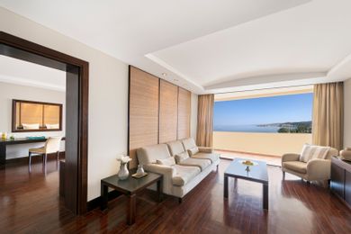 Spacious two-bedroom suites, each offering en suite marble bathroom (one with hydromassage bathtub) connected to well-appointed sitting area with an interconnected door & separated WC and superb side sea view. All suites are equipped with hairdryer, makeup & shaving mirror, bathroom ameniti es, bathrobes & slippers, coffee & tea facilities, telephone, SAT TV, Air-condition, mini bar, Safe, free WI-Fi and furnished balcony.
