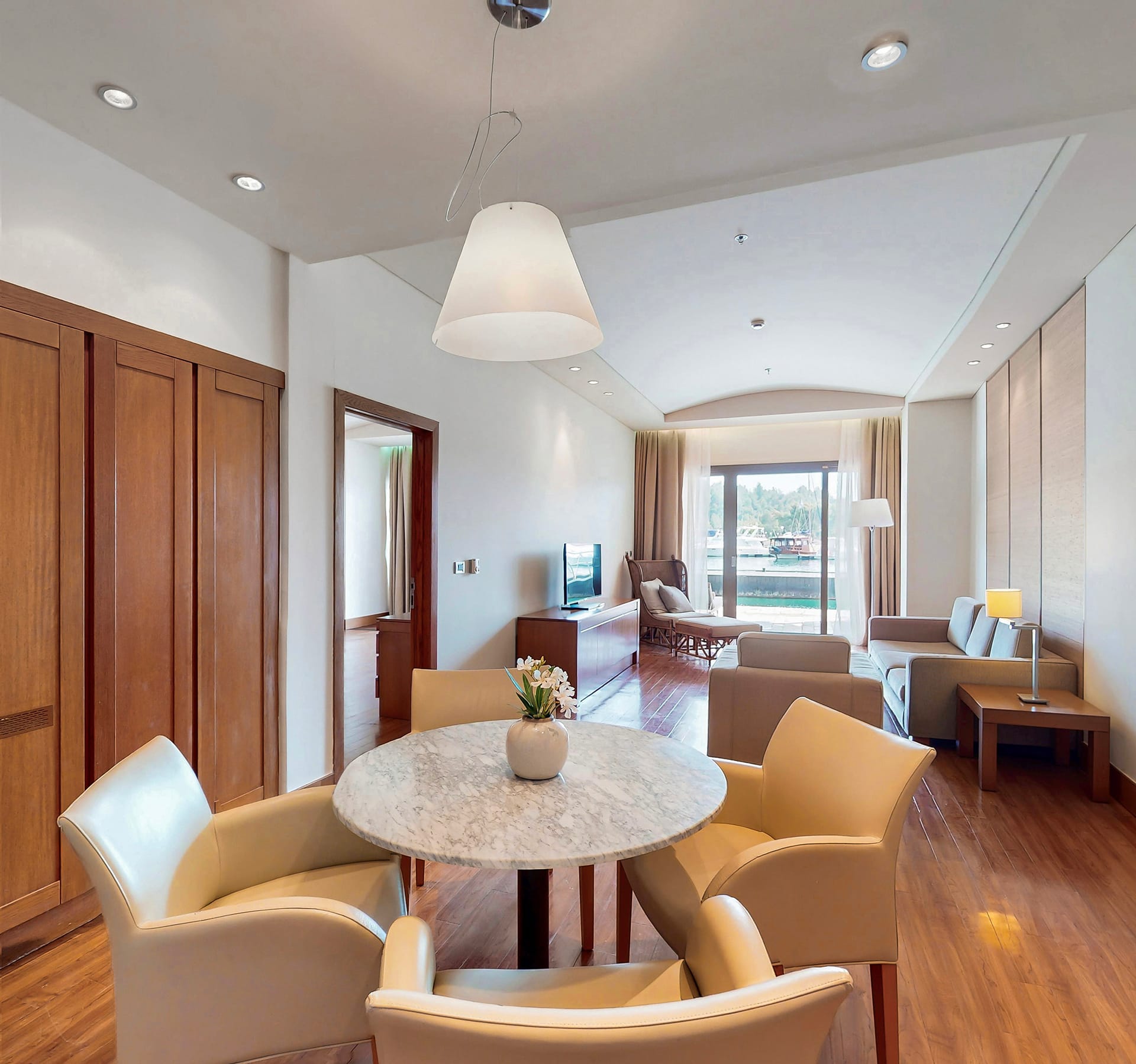 Magnificent one-bedroom suites marina front, offering en suite marble bathroom equipped with hydromassage bathtub & shower cabin, separated living area with a dinning corner and WC and superb sea & marina view. All suites are equipped with hairdryer, makeup & shaving mirror, bathroom amenities, bathrobes & slippers, coffee & tea facilities, telephone, SAT TV, Air-condition, mini bar, Safe, free WI-Fi and furnished Terrace with sunbeds & private docking for boats up 25m.